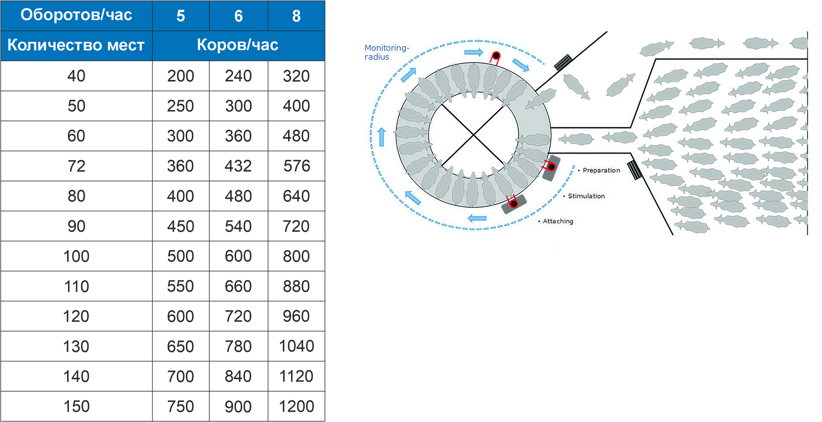 Ротор доступен с платформами на 40, 50, 60, 72, 80, 90, 100, 110, 120, 130, 140 и 150 мест.