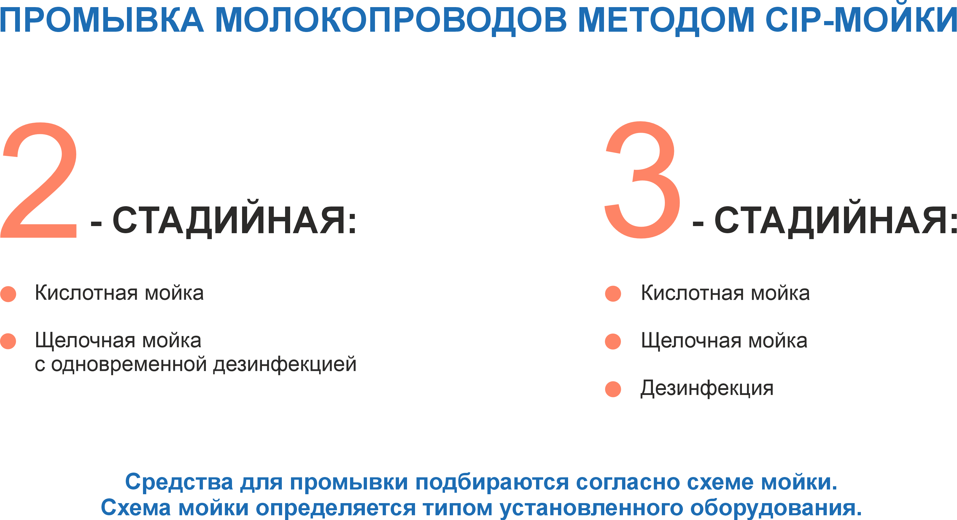 Промывка доильного оборудования и танков-охладителей осуществляется методом внутренней (CIP) мойки, которая может осуществляться в 2 или 3 стадии, в зависимости от установленного заказчиком оборудования. Специально для внутренней мойки предназначены беспенные кислотные и щелочные средства, а также средства для внутренней дезинфекции.