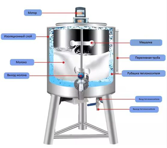 Перемешивание продукта осуществляется мешалкой, вращающейся от мотор-редуктора. Нагрев продукта достигается за счет нагрева воды в межстенном пространстве. Для улучшения теплообмена продукт перемешивается мешалкой. Охлаждение продукта в ванне осуществляется заполнением межстенного пространства артезианской или ледяной водой. Все детали, контактирующие с продуктом, выполнены из коррозионностойких марок сталей, допущенных к применению в пищевой промышленности. Слив готового продукта - через затвор дисковый Ду50.
